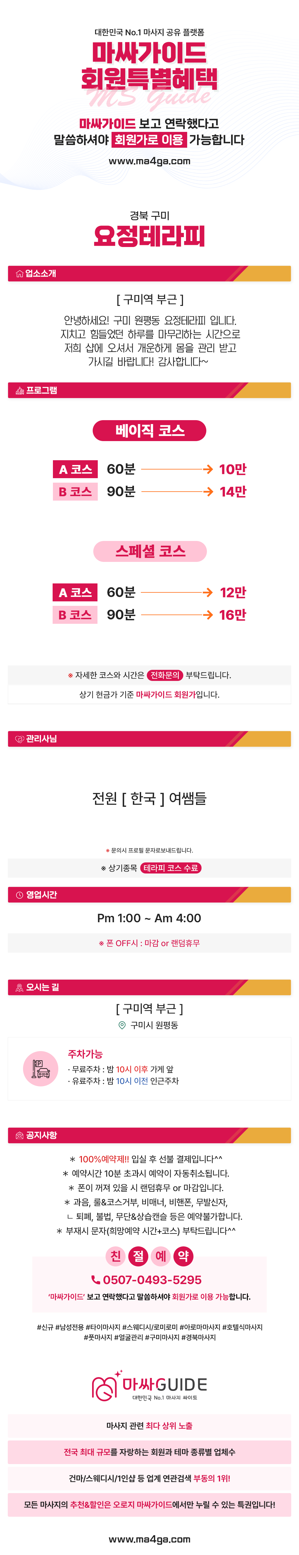 대도시의 번잡함과는 다르게, 구미는 테라피를 받기에 적당히 조용하고 한적한 분위기가 조성되어 있어 마음이 놓였습니다. 특히 원룸촌, 상업지구 등과 약간 떨어진 위치에 위치한 샵들은 마치 ‘도심 속 휴양지’처럼 느껴졌습니다. - 실력 있는 테라피스트 다수 상주